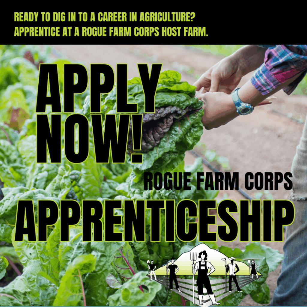 Interested in exploring sustainable/regenerative farming and becoming part of the climate-smart agricultural movement? Earn a wage while you train with dedicated Host Farm mentors through a Rogue Farm Corps Apprenticeship! Apprentices learn and work at one of RFC’s partner Host Farms across the state of Oregon. This hands-on, real-world field training is complemented by a series of classes, farm tours, discussions, and networking events organized by Rogue Farm Corps.